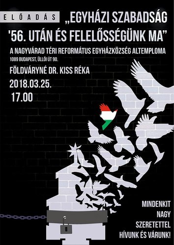 2018. március 25., vasárnap, BudapestEgyházi szabadság '56 után és felelősségünk ma címmel tart előadást Földváryné Kiss Réka, a Nemzeti Emlékezet Bizottság elnöke március 25-én (vasárnap) 17 órától a Budapest-Nagyvárad téri Református Egyházközség altemplomában.