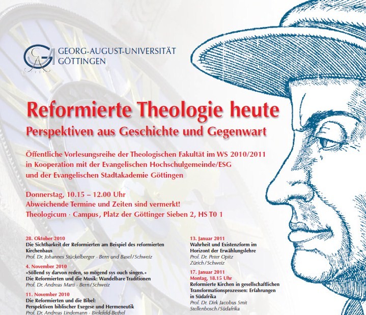 A teológiai fakultás, továbbá a Protestáns Főiskolai Gyülekezet és a göttingeni Protestáns Városi Akadémia közös szervezésében az előadásokra délelőtt 10.15–12.00 óra között kerül sor. Három előadás már lezajlott. Október 28-án dr. Johannes Stückelberger professzor szólt egy érdekes témáról: Mennyiben teszi láthatóvá a református mivoltot a református egyházépítés? November 4-én dr. Andreas Marti professzor a reformátusok és a zene kapcsolatáról értekezett. November 11-én pedig dr. Andreas Lindemann elemezte a reformátusok és a Biblia kapcsolatát, s felmutatta a bibliai szövegmagyarázás és szövegértelmezés távlatait. Jövő év január 13-án folytatódik a sorozat. Akkor dr. Peter Opitz taglalja ezt a témát: igazság és életforma a kiválasztás tanának tükrében. Január 17-én zárul a sorozat dr. Dirk Jacobus Smit dél-afrikai professzor vendégelőadásával, aki a református egyházak szerepét elemzi majd a társadalmi változásokban, kiváltképpen dél-afrikai példákon mutatja be a folyamatokat. (reformiert-info.de – 2010-11-11 – dr. békefy-röhrig klaudia – reformatus.hu)